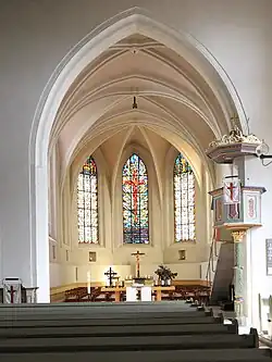 Der aus Schlussjoch und zwei Langjochen gebildete Chor hat sieben Spitzbogenfenster. Er ist 14,5 Meter lang und 8,0 Meter breit. Dendrochronologisch wurde der Dachstuhl des Chors auf das Jahr 1406 datiert.[1] Den Chor überspannt ein Satteldach. Es hat eine Spannweite von etwa 9,1 Metern, eine Höhe von etwa 9,8 Metern, eine Länge von etwa 15,6 Metern und eine Steigung von rund 65 Grad. Die Konstruktion besteht aus 15 Gespärre mit drei Kehlbalkenlagen. Der Chorabschluss ist polygonal ausgebildet.[1]