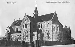 Das Kloster und eine erste Kirche wurde zwischen 1903 und 1904 von Franziskanern der Sächsischen Franziskanerprovinz Saxonia gegründet und erbaut[1]. Dem waren nach dem Kulturkampf in Preußen zwölfjährige Verhandlungen mit dem preußischen Kultusministerium um die Genehmigung zur Klostergründung vorangegangen, die am 3. Februar 1902 erteilt wurde. Die Franziskaner wollten sich in Essen schwerpunktmäßig der Seelsorge an den italienischen und polnischen Arbeitern und ihren Familien in der Stadt widmen.[2] Zum Kloster gehörten etwa sieben Patres und vier bis fünf Laienbrüder. Das Grundstück wurde für die Saxonia durch den Huttroper Gutsbesitzer und Gerichtstaxator Feldhaus für 72.000 Mark erworben, das Eigentum wurde auf das Franziskanerkloster Wiedenbrück eingetragen, das als juristische Person mit Kooperationsrechten galt; später wurde das Eigentum an die „Florentin Kaufmann & Co. Gesellschaft mit beschränkter Haftung“ (benannt nach Provinzialminister Joseph Kaufmann), den Rechtsträger der Ordensprovinz Saxonia, übertragen. 1917 wurde ein Nachbargrundstück erworben, um einen Freiraum zwischen dem Kirchengrundstück und einem evangelischen Mädchenfürsorgeheim zu gewährleisten.[3]