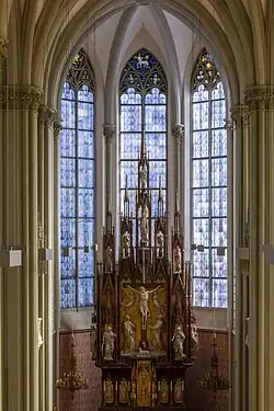 - ↑ Ehemals war eine Stiftung wie die eines Kirchenfensters an eine finanzielle Ausstattung gebunden. Stifter hatten hierfür einen Teil ihres Vermögens abgezweigt, um als Gegengabe die Gebete für ihr Seelenheil zu erhalten und zugleich im Kirchenraum repräsentiert zu sein. Meistens wurden deren Wappen und Inschrift im unteren Bereich „ihres“ Kirchenfensters angebracht, oder die Person des Stifters mit Familie zeigte sich, beispielsweise auf Altarretabeln, empfohlen von ihrem jeweiligen Namenspatron.