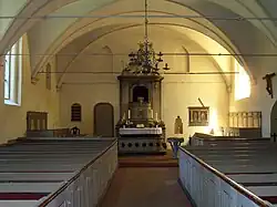 Zur Ausstattung gehört ein Kanzelaltar von Mayer aus dem Jahr 1743. Der Altar ist gemauert und mit Holz verkleidet, dahinter auf einer muschelförmigen Konsole der abgerundete Kanzelkorb. Die Brüstungsfelder sind in bläulichem Ton gehalten und zeigen mittig eine Wolkenglorie mit einem darüber angebrachten Engelskopf, sowie links und rechts Abendmahlsgerät wie Kelch, Patene sowie Taufkanne und Taufschale Der Zugang erfolgt durch eine segmentbogige Tür mit marmorierten Pilaster. Oberhalb des Kanzelkorb ist ein baldachinartiger Schalldeckel, der mit einer Krone verziert ist. Ein Brüstungsfragment aus der ersten Hälfte des 17. Jahrhunderts hängt an der östlichen Chorwand. Es besteht aus zwei bemalten Holztafeln und zeigt Jesus Christus sowie Simon Petrus. Links daneben ist eine Sakramentsnische mit einer Skulptur. Der Chor hat in seinem Innern ein Kreuzgewölbe.