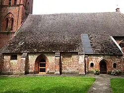 An der Nordseite ist eine kleine Sakristei. Sie hat einen quadratischen Grundriss und an der nördlichen Seite eine hölzerne Pforte. Darüber ist im kielbogenförmigen Giebel ein Stern gemauert. Östlich ist ein kleines Fenster; die Westseite ist geschlossen. Der Giebel wird von einem kleinen Türmchen mit einem Kreuz gekrönt. An der Chorseite sind zwei große spitzbogenförmige Fenster, gefolgt von einem Strebepfeiler. Das Kirchenschiff fußt auf einem Sockel aus unbehauenen Findlingen. Darüber sind drei große Fenster mit je einem mächtigen Strebepfeiler. Die Reste des ursprünglich vorhandenen Seitenschiffs sind an Abbruchkanten erkennbar.