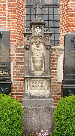 An der Kirchenmauer befinden sich zahlreiche Grabdenkmäler der Hofmarksherren und der Ortsgeistlichen. Direkt hinter dem Priestergrab ist ein bemerkenswertes Rotmarmorepitaph für Kaplan Georg Hirlhayder († 1481) zu sehen. Es enthält die Inschrift: Im Jahr 1481 am Vorabend Johannes des Täufers starb Georg Hirlhayder, Caplan dieser Kirche und ist hier begraben. Daneben befinden sich zwei Grabsteine aus gebranntem Ton mit erhabener Schrift. Diese sind dem Priester Franciscus Mockel († 1495) und dem Schmied Bartholomäus Mockel († 1500) gewidmet. Der dritte heute noch erhaltene Grabstein dieser Art befindet sich neben den Kriegergedenktafeln im Inneren der Vorhalle, stammt ebenfalls aus der Zeit um 1500 und erinnert an den Kaplan Konrad Ödenkas. 1835 erwähnte Alois Staudenraus noch acht solcher Epitaphien, wobei die Fragmente von drei dieser Tonplatten heute im Stadtmuseum untergebracht sind. Von besonderer Bedeutung ist auch das Grabmal des Pfarrers Anton Mayr († 1870), das von Wilhelm Schweinberger im neugotischen Stil errichtet wurde. Es wird als einzige Grabstätte des Friedhofs explizit in der Denkmalliste des Bayerischen Landesamtes für Denkmalpflege erwähnt. Vor der Kirche steht zur Wasserversorgung des Friedhofs ein Wasserbecken mit einem sehenswerten schmiedeeisernen Gitter aus dem 19. Jahrhundert.[2][3][12][13]