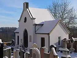 Bis heute ist die Pfarrkirche von einem Friedhof umgeben, der – obwohl der älteste der Stadt Landshut – eher die Anmutung eines Dorffriedhofs besitzt. Die geringe Größe von etwa 200 Grabstätten ist mit der Tatsache zu begründen, dass die eher kleine Pfarrgemeinde erst durch die Eingemeindung von Berg ob Landshut im Jahr 1928 zur Stadtpfarrei wurde. Die Friedhofsmauer ist im Kern spätmittelalterlich und stammt somit noch aus der Erbauungszeit der Kirche. Die Aussegnungshalle im Südteil des Friedhofs wurde im 19. Jahrhundert errichtet und ersetzte die ehemalige Seelenkapelle. Sie enthält das Altargemälde des klassizistischen Hochaltares, auf dem die Kreuzigung Christi dargestellt ist. Dieses wurde 1789 von dem Landshuter Maler Ignaz Bergmann angefertigt. Links und rechts des Bildes befinden sich zwei klassizistische Urnen, die auch zu dem Jorhan-Altar aus dem Jahr 1790 gehört haben.[12]
