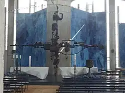Das sieben Meter hohe und neun Meter breite Monumentalkreuz prägt das liturgische Zentrum. Es besteht aus Stahlabfällen unterschiedlichster Herkunft, daher auch die Bezeichnung „Schrottkreuz“. Nicht allein die triumphale Überwindung von Leid und Tod steht hier im Vordergrund, sondern die Unzulänglichkeit des Menschen.[7]