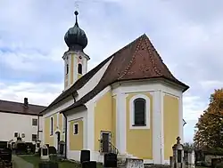 Die barocke Saalkirche wurde 1701 anstelle des spätgotischen Vorgängerbaus errichtet. Sie besteht aus dem Langhaus zu zwei Jochen und dem eingezogenen, dreiseitig geschlossenen Chor im Osten, der beidseitig von Sakristeien flankiert wird. Über der Fassade im Westen erhebt sich ein Dachreiter mit Zwiebelhaube und Turmuhr.