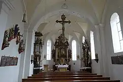 Der Innenraum des Langhauses ist mit einem Stichkappengewölbe überspannt. Er ist von dem des Chors durch einen Chorbogen getrennt. Das spätgotische Kruzifix wurde 1638 zum Gnadenstuhl ergänzt. Im Chor befindet sich eine Wandmalerei. Der Hochaltar wurde 1663 aufgestellt. Auf seinem Altarretabel ist eine Kreuzigungsgruppe dargestellt, die von Tafelbildern flankiert wird.
