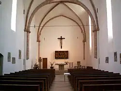 Die Kirche ist ein einschiffiger gewölbter Bau von klassischer Einfachheit und vollkommen symmetrischer Anlage ohne Apsis und ohne Turmvorlage. Die Formen sind frühgotisch. Die Mauern bestehen aus Bruchsteinen, Pfeiler, Rampen und Gurte sind behauener Sandstein. Die Kirche ist in fünf gleiche Joche gegliedert, die mit Kreuzgewölben gedeckt sind. Die Quergurte setzen auf schlichten Wandpfeilern auf, die in zwei Meter Höhe beginnen. Durch Orgelempore und Bau einer Zwischenwand (im Jahr 1954)[1] sind nur noch drei Joche überschaubar.