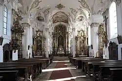 - Der 1758 eingebaute Hochaltar und die 1759 aufgestellten Seitenaltäre wurden wie die 1757 angefertigte Kanzel von Jakob Steinle nach Entwürfen von Johann Michael Fischer ausgeführt, der auch die Assistenzfiguren schuf.