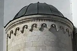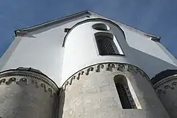 Wie der Turm sind die drei Apsiden unverputzt und stammen noch aus dem romanischen Vorgängerbau. Nur die Dächer gehen auf die Zeit des barocken Umbaus zurück. Am oberen Rand der Apsiden verläuft ein Bogenfries mit Rundstäben und Konsolen, die wie die Bogenfelder mit Köpfen von Menschen und Tieren skulptiert sind. Über den beiden äußeren Apsiden ist ein profiliertes Gesims mit Zahnschnittfries erhalten, bei der später erhöhten Mittelapsis wurde es abgeschlagen.