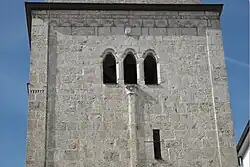 Der freistehende, quadratische Turm aus unverputzten Quadern an der Südseite der Kirche ist in fünf Stockwerke gegliedert. Die drei unteren Geschosse stammen aus der Zeit des Wiederaufbaus der Kirche in der zweiten Hälfte des 12. Jahrhunderts. Sie sind von schießschartenartigen Öffnungen durchbrochen und weisen von Lisenen, Rundbogen- und Zahnfriesen gerahmte Blendfelder auf. Das Glockengeschoss, in dem sich dreifach gekuppelte Klangarkaden mit gotischen Dreipassbögen öffnen, wurde gegen Ende des 13. Jahrhunderts aufgesetzt. 1799 wurde das von einem Zeltdach bekrönte oberste Geschoss erneuert. Der Turm, der auch als Wehrturm diente, besaß nur einen über eine Leiter erreichbaren Zugang im ersten Stockwerk.
