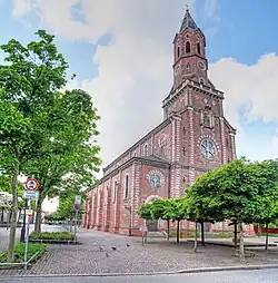 Die neuromanische Basilika wurde 1861–63 nach einem Entwurf von Heinrich Hübsch gebaut. Ihr Langhaus besteht aus einem Mittelschiff und zwei Seitenschiffen. Die Seitenschiffe werden von Strebepfeilern gestützt. Im Süden des Mittelschiffs befindet sich ein gleichbreiter, halbrund geschlossener Chor. Der in das Mittelschiff im Norden eingestellte Fassadenturm hat zwei achteckige Geschosse, das untere beherbergt die Turmuhr, das obere den Glockenstuhl.