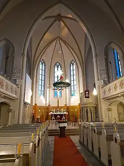 Der Innenraum ist mit Kreuzrippengewölben geschlossen und wird von eingeschossigen Emporen an drei Seiten umgeben; dadurch sind auch die Querhäuser abgetrennt. Stilistisch ist die Kirche durch die schlichte, an die hochgotische Architektur angelehnte Gestaltung charakterisiert, die gleichwohl ihre späte Entstehungszeit nicht verleugnet.