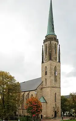 Das Bauwerk ist ein Hausteinbau mit eingezogenem Chor und polygonaler Apsis. Der dominierende, 72 m hohe Westturm ist über quadratischem Grundriss erbaut und wird von einem oktogonalen Glockengeschoss mit Spitzhelm und Fialen bekrönt.
