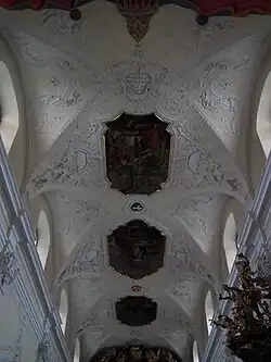 Geschichte des hl. Kreuzes und des hl. Norbert. Gezeigt wird Christus als Weltenrichter, die Apostel Petrus und Paulus und der hl. Augustinus. Im unteren Teil des Bildes werden fünf Ordensgründer dargestellt. Sichtbar ist zum Beispiel der hl. Norbert im weißen Gewand. Das Gemälde stammt aus dem Jahr 1742 und ist mit Fecit Joseph GRV Veronensis signiert.[2]