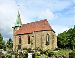 Die gotische Saalkirche aus Bruchsteinen wurde durch Erweiterung und Umbau eines romanischen Vorgängers im 14. Jahrhundert errichtet. Sie besteht aus einem Langhaus und einem eingezogenen Chor mit Fünfachtelschluss im Osten, deren Wände von Strebepfeilern gestützt werden, und einem Kirchturm im Westen, der mit einem achtseitigen Knickhelm bedeckt ist. Hinter seinen als Biforien gestalteten Klangarkaden befindet sich der Glockenstuhl. Der Innenraum wurde 1987/88 mit einer Holzbalkendecke überspannt.