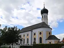Das Bauwerk ist eine Saalkirche mit einem leicht eingezogenen, halbrund schließenden Chor, einer Sakristei an dessen Ostseite und einem Turm im nordöstlichen Winkel, der im unteren Geschoss quadratisch, im oberen achteckig gebildet und mit einer voluminösen Zwiebelhaube abgeschlossen ist. Die Kirche ist außen durch Felder mit Rundbogenfenstern und Blendokuli gegliedert. Das Innere ist durch Tonnengewölbe mit Stichkappen im Chor, im Langhaus durch Flachtonnengewölbe über Wandpfeilern mit breiten Pilastern und Schildbögen abgeschlossen. Die Deckenfresken zeigen im Chor Christus mit dem Zeichen des Sieges aus dem Jahr 1778 von Augustin Joseph Demmel und im Langhaus Darstellungen der Kreuzeslegende, gemalt von Joseph Franz Xaver Graß im Jahr 1779 aus Miesbach, mit typologischen Verweisen auf das Kreuz in den Stichkappen. Im Westen ist eine Empore eingebaut.