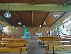 Die geostete Kirche befand sich in rund 57 Meter Höhe über dem Meeresspiegel. Sie wurde, als Beton-Fertigteilkirche mit glockenlosem Turm, nach Plänen von Josef Fehlig errichtet und bot 195 Sitzplätze. Den Altar, das freistehende Kruzifix, den Tabernakel, die Marienstatue und die Buntglasfenster schuf der Rottweiler Maler und Bildhauer Siegfried Haas (1921–2011). Zur Innenausstattung der Kirche gehörten ferner ein Beichtstuhl, eine elektronische Orgel und 14 Kreuzwegstationen. Nördlich an den Kirchenraum angrenzend, und von ihm durch Falttüren getrennt, befand sich der Gemeindesaal. Auf dem Kirchengrundstück stand ferner ein mehrere Meter hohes Holzkreuz.