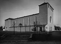 Die Außenwände aus Backstein sind ausschließlich durch die hohen, schmalen Rundbogenfenster gegliedert, deren schlanke Stürze mit Tuffstein abgesetzt sind. Ein großes Rundfenster dominiert den Eingangsbau, der sich durch drei Rundbogenportale ins Innere öffnet. Seitliche Eingänge bieten je einen kleinen Raum für die persönliche Andacht.