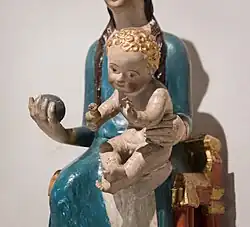 Ein Teil des Figurenschmucks in Heilig Kreuz sind mittelalterlich, von hoher Qualität und gelangten in den 1930er Jahren in die Kirche. Eine Madonna mit Kind, die so genannte „Merheimer Madonna“ stand ursprünglich in einem Heiligenhäuschen an der Neusser Straße – der so genannten Anna-Kapelle, da man sie für eine Abbildung der Heiligen Anna mit ihrem Kind Maria hielt. Erst 1937 kam man bei einer Restaurierung zu der Erkenntnis, dass es sich um eine Madonna-mit-Jesuskind-Darstellung handelt, und dass das leicht „überdimensionierte“ Jesuskind aus einer völlig anderen Epoche als die Marienfigur stammt: Die romanische Madonna entstand um 1210 und das spätgotische Jesuskind etwa um 1430. Im Jahr 1954 erhielt sie eine neue Fassung und steht inzwischen in der Marienkapelle seitlich vom Chor.[7]