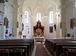 Das Langhaus ist mit einem Tonnengewölbe überspannt, der Chor mit einem Stichkappengewölbe.[2]