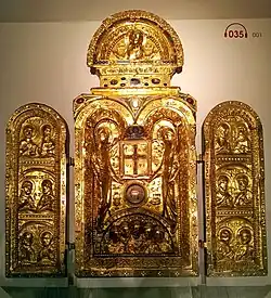Der Legende nach wurden die Fragmente des Heiligen Kreuzes von Robert II., König von Frankreich, an Heinrich II. übergeben, der sie 1066 der Kirche Heilig Kreuz in Lüttich schenkte. Diese Reliquien, die als kleines goldenes Kreuz angeordnet waren, wurden um 1160[15] in das Triptychon eingearbeitet.
