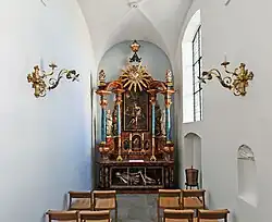 Die Kreuzigungsgruppe im Hochaltar wurde vom ebenfalls ortsansässigen Künstler Leonz Fridolin Düggelin 1733 gemalt. Die zahlreichen Holzplastiken im Barockstil wurden von Meister Jakob Hunger aus Rapperswil und dem Bildhauer Johann Baptist Wickart aus Zug erstellt. Der Hochaltar ist vom Altarbauer Johann Kaspar, St. Fiden.[2]