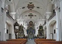 Die Kirche ist im Barockstil nach Vorarlberger Schema aus Stein erbaut. Die Länge beträgt 45 m, die Breite des Kirchenschiffs 18 m. Ihr Äusseres wird durch zwei markante, kuppelbedeckte Türme von 47 m Höhe im Osten sowie den Chorturm im Westen bestimmt. Die Kirche fasst 350 Personen im Schiff und 60 auf den Seitengalerien.[1]