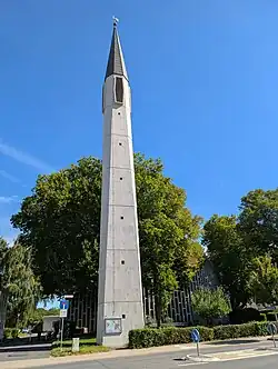 Die Pfarrkirche Hl. Kreuz wurde nach einem Entwurf des Rheydter Architekten Alfons Leitl mit Fächer-förmigem Grundriss errichtet, so dass die Plätze der Gemeinde im Halbkreis um den Altar angeordnet sind. Die Kirche zeichnet sich durch die Aufteilung in zwei Gottesdienstbereiche aus. Im hinteren Teil der Kirche findet eine kleinere Gemeinde Platz. Die Orgel wurde 1974 von Hugo Mayer Orgelbau erbaut. Sie hat 21 Register auf zwei Manualen und Pedal.[2] Etwas abseits von der Kirche steht der Turm. Er ist 45 m hoch und ein Wahrzeichen im östlichen Stadtteil, dem Sonnenland. Mit seiner Architektur erinnert er an eine Rakete.