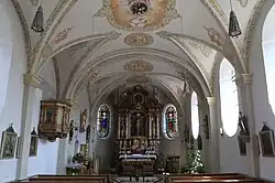 Die spätgotische Saalkirche wurde im 18. Jahrhundert barock umgestaltet. Sie besteht aus dem Langhaus, dem eingezogenen, dreiseitig geschlossenen Chor im Osten und dem Chorflankenturm aus Tuffsteinquadern über einem Granitsockel an der Nordwand des Chors. Im obersten Geschoss des Turms hängen drei Glocken. Über den Klangarkaden bzw. auf den Giebeln sind die Zifferblätter der Turmuhr angebracht. Die Sakristei steht an der Nordostecke von Chor und Turm. Mitte des 19. Jahrhunderts wurde im Westen der Vorraum mit dem Portal angebaut.