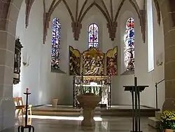 Der Innenraum des Langhauses hat Emporen an der West- und Nordseite. Zur Kirchenausstattung gehört ein Flügelaltar von 1510, der dem Umkreis von Martin Schaffner zugeschrieben wird. Die Orgel wurde 1974 von der Giengener Orgelmanufaktur Gebr. Link als Opus 941 in den alten Prospekt eingebaut.[1]