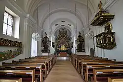An das dreijochige, barocke Langhaus mit Kreuzgratgewölben schließt im Norden der eingezogene Chor mit 3/8-Schluss. Der östlichen Seitenkapelle (ehemals gotischer Chor) ist eine barocke Kapelle im Westen gegenübergestellt.