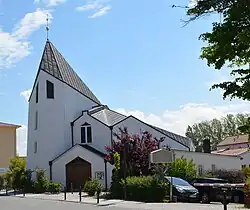 Der weiß verputzte Bau orientiert sich an den Elementen Himmelszelt und Kirchenschiff. Allerdings sind die Bauformen modern interpretiert, sie bilden vielfältig verschachtelte, oft schräge und dreieckige Flächen und Bauglieder, so dass das historische Vorbild einer Dorfkirche äußerlich nicht wirklich erkennbar ist. Der große Raum bietet 270 Sitzplätze, die mittels einer Schiebewand, die den Gemeindesaal abtrennt, um 60 Plätze ergänzt werden können.[1]