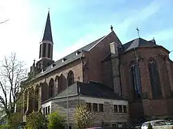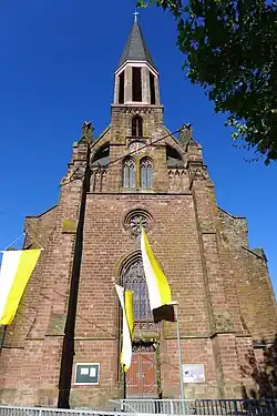 Die neogotische Kirche wurde in den Jahren 1881 bis 1883 nach den Entwürfen des Architekten Carl Friedrich Müller in dunkelrotem Buntsandstein errichtet.[17][18][19][20][21][22][23][24][25]