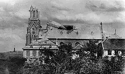 Am Sonntagabend 28. Juli 1895 wurde die verschieferte Turmhaube des neogotischen Neubaues während eines schweren Gewittersturmes mit faustdicken Hagelkörnern[9] abgerissen und stürzte auf das Dach des Kirchenschiffes. Vermutlich kam es auch zu einem Blitzeinschlag. Auch im nahegelegenen Pachten wurde der neuerrichtete Turmhelm der Kirche St. Maximin ein Opfer des wohl schwersten Sturmes im Saarland und im angrenzenden Lothringen im 19. Jahrhundert. Durch mitgerissene Teile des Giebelkranzes des Turmoktogons stürzten Gewölbeteile der Lebacher Kirche ein, die Orgel wurde zertrümmert und der Innenraum war unbenutzbar. Der Saarlouiser Kreisbaumeister veranschlagte die Kosten für die Behebung der entstandenen Gebäudeschäden auf 12.000 bis 14.000 Mark, wobei die Kosten für die zerstörte Orgel nicht eingerechnet waren.[10][11] Dank Spenden der Lebacher Pfarrangehörigen konnte der Wiederaufbau bald darauf begonnen werden.