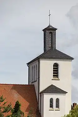 Der Querturm, der mit niedrigeren seitlichen Anbauten versehen ist und durch den der Zugang zur Kirche erfolgt, ist mit einem Dachreiter bekrönt, auf dem sich ein goldenes Kreuz befindet. Die Dächer des Turmes und der Dachreiter sind mit Schiefer eingedeckt. Hinter den rundbogigen Klangarkaden befindet sich das aus drei Glocken bestehende Geläut. Eine über dem Portal angebrachte überlebensgroße Statue stellt Jesus Christus mit Opferlamm und Segensgestus dar. Nach anderer Quelle soll es sich bei der Statue um Johannes den Täufer handeln.[10] Dem Portal, das von zwei großen Laternen in schmiedeeiserner Arbeit flankiert wird, ist eine dreistufige Freitreppe aus Kunststein vorgelagert.