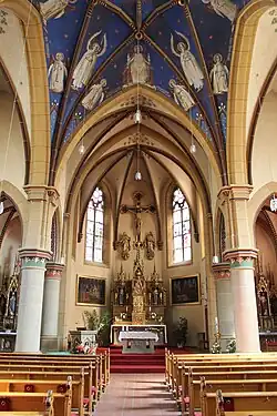 Die Ausstattung der Erbauungszeit ist fast vollständig erhalten. Dazu zählen die Altäre sowie die Fenster mit ihren gotisierenden Bildern. Im Jahr 1924 wurde das Gewölbe in der Vierung mit einer Darstellung von Maria als Himmelskönigin und den Engeln ausgemalt. Weitere Teile der Ausstattung sind die Kreuzigungsgruppe im Chorraum und die beiden großformatigen Bilder des Kunstmalers Cullmann, die seit 1949 den Hauptaltar flankieren.[3]