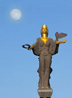 Die aufrecht stehende Figur einer jungen Frau mit Blick nach Osten, ausgestreckten Armen und wehendem Umhang hält einen Lorbeerkranz in der rechten Hand. Auf dem ausgestreckten linken Arm sitzt eine Eule als Symbol der Weisheit. Der Lorbeerkranz ist das Symbol der obersten Macht. Seine kreisrunde Form symbolisiert die Unendlichkeit (Ewigkeit), die Vollkommenheit und die sich erneuernde Lebenskraft. Schon in der Antike galt der Kreis als Sinnbild für eine ideale Ordnung. Andererseits ist der Kranz das Symbol des Sieges, in der Antike wurden Sieger damit geehrt.