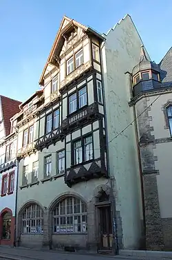 Das große Fachwerkhaus wurde im Jahr 1902 von A. Müller erbaut, auf den eine Inschrift hinweist. Die unteren Etagen sind in massiver Bauweise errichtet. Es finden sich hier neogotische Formen. Die oberen in Fachwerkbauweise erstellten Stockwerke verfügen über einen Kniestock. Darüber hinaus wurden viele traditionelle Verzierungen eingesetzt. So gibt es Taustab, Schiffskehle, Fächerrosetten am Fußwinkelholz, Rautenfachwerk und Fußstreben. Der Einsatz von Fachwerkelementen erfolgte auf Drängen des städtischen Bauamtes.[1]