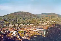 | Die zwei Gipfel des Heiligenbergs neckaraufwärts gesehen, im Vordergrund Neuenheim | |