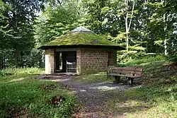Die genaue Entstehungszeit und Funktion des 56 Meter tiefen Heidenlochs sind unbekannt. Vermutlich handelt es sich um einen Sodbrunnen, der die Wasserversorgung auf dem Heiligenberg sicherstellen sollte. Gelegentlich wird ein antiker Ursprung der Anlage vermutet, teilweise verbunden mit einer Interpretation als keltischer Opferschacht. Die Fundstücke aus dem Brunnen und der archäologische Forschungsstand sprechen jedoch für eine Anlage im Hochmittelalter zur Versorgung des nahegelegenen Stephansklosters.[37] 1987 wurde der Schacht freigelegt und eine Schutzhütte darüber errichtet.[38] Neben dem heute so bezeichneten Heidenloch wurden in der Vergangenheit auch verschiedene weitere gemauerte Brunnen oder Zisternen auf dem Berg als „Heidenloch“ bezeichnet.[39]
