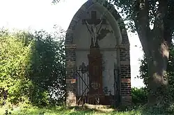 In einer Höhe von 5 m ist der gekreuzigte Christus dargestellt. Am Fuß des Kreuzes ist folgende Inschrift zu lesen:[2]