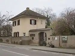 Im Eingangsbereich befindet sich ein zweistöckiges Wächterhaus. Es wurde von den Wormser Architekten Georg Rohr und Ludwig Bruckmann unter Verwendung von Formen des Jugendstils und des Expressionismus 1913 oder kurz zuvor erbaut. Auffallend waren insbesondere die „runden Ecken“ und die Lage der Fenster im Obergeschoss, nämlich genau in diesen runden Ecken.[54] Das Gebäude wurde nach dem Zweiten Weltkrieg in vereinfachten Formen wieder hergerichtet. Weiter stand im Eingangsbereich das Taharahaus zum Waschen der Toten, ein Becken zum Waschen der Hände nach Verlassen des Friedhofs, das innere Tor zum Gräberfeld und die Inschrift mit dem großen Totengebet.