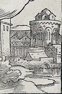 Mehrere alte Zeichnungen zeigen, dass diese sehr bedeutende romanische Kirche wie die Grabeskirche aus einer sog. Templerrotunde, also einer für Kirchen des Templerordens typische Rotunde bestand,[11] an die sich Konventsgebäude anschlossen. Auf einem Holzschnitt des Jahres 1550 aus Sebastian Münsters Cosmographia ist der Rundbau am äußersten rechten Rand zu sehen, wird aber von einer anderen Kirche verdeckt. Etwas besser zu sehen ist sie auf einem Kupferstich aus Frans Hogenbergs Civitates Orbis Terrarum von 1537 und einer ähnlichen aus dem Jahre 1600 stammenden Stadtansicht. Nicht mehr zu sehen ist das Bauwerk auf der aus dem Jahr 1637 stammenden Stadtansicht von Matthäus Merian, wo ein dort befindliches Gebäude als Lazarett bezeichnet wird. Sehr gut zu erkennen ist die Anlage auf Philipp Stürmers Bild Die Freie Reichsstadt Speyer vor der Zerstörung im Pfälzischen Erbfolgekrieg 1689. Auch auf dem Holzschnitt Der Speyerer Bannersträger aus Jacob Kallenbergs Wapen. Des Heyligen Römischen Reichs Teutscher nation ist die Kirche gut zu erkennen.