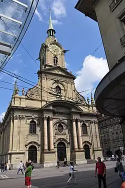 Es wurde ein reiner Predigtsaal ohne Chorpartie angestrebt. Das nordsüdlich ausgerichtete rechteckige Innere ist charakterisiert durch 14 monolithische, in einem Oktogon angeordneten, korinthischen Säulen aus Sandstein und eine hochaufgerichtete freistehende Steinkanzel aus der Zeit des Berner Barock im Nordteil des Mittelschiffes. Das von freistehenden Säulenpaaren gerahmte und von Nebenportalen flankierte Mittelportal führt in die Turmhalle. Mächtige Säulen scheiden im Inneren den mit Emporen versehenen Umgang vom Raumkern. Die Stucktonne und der oktogonale Säulenschluss der Schmalseiten formen einen zentrumsbetonten Raum. Die Régence-Stuckatur der gesamten Deckenzone über dem Schiff und den Emporen, von Joseph Anton Feuchtmayer ausgeführt, ist das Hauptwerk dieser Art in Bern.[2]