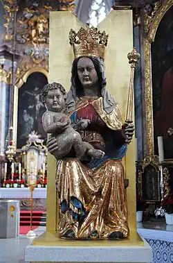 Ursprünglich war die Figur, wie die Gnadenmadonna in Dimbach, bekleidet. Heute präsentiert sie sich als schlichte Holzfigur der sitzenden Gottesmutter. Sie hält links ein beleibtes nacktes Christuskind mit einem Apfel auf dem Arm, während links ein goldenes Zepter angebracht wurde. Ein rotes Gewand ist mit einem goldenen Mantel bedeckt, der innen eine blaue Färbung aufweist und reiche Falten schlägt. Marias Gesicht wendet sich Jesus zu, eine Krone schließt die Figur nach oben hin ab.[9]