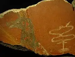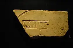 - Fragment einer Tabula ansata (Tafel mit zwei Handgriffen) aus Sandstein, die an einer Mauer befestigt war. In der Inschrift wird Vespasian genannt, der vom 1. Juli 69 bis 23. Juni 79 römischer Kaiser war:[10]