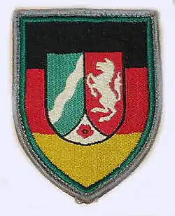 Das Verbandsabzeichen stellte die Verbindung zum Stationierungsraum her. Der aufgelegte Schild entsprach dem Wappen Nordrhein-Westfalens: Der Wellenbalken repräsentierte das Rheinland. Das Westfalenpferd stand für Westfalen. Die Lippische Rose stand für den dritten Landesteil Lippe. Die Teilung des Hauptschildes entsprach der Flagge Deutschlands. Viele Schilde der Verbandsabzeichen der Dienststellen im Territorialheer zeigten den schwarz-rot-goldenen Schild, der an die rein nationale Führung dieser Dienststellen außerhalb der NATO-Kommandostruktur erinnerte. Der grüne Bord war typisch für alle Heimatschutzkommandos in der Heeresstruktur III. Grün war die Waffenfarbe der Jägertruppe, denn die meisten Heimatschutzkommandos ähnelten im Kern Jägerbrigaden.