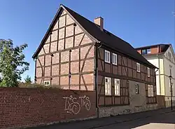 Das zweigeschossige Fachwerkhaus entstand im Jahr 1801 als Nebengebäude eines Bauernhofs.[1] Andere Angaben sahen in dem das Straßenbild prägenden Haus ein Beispiel eines weitgehend unverändert erhaltenen Wohnhauses eines mittleren Bauern.[2] Das schlicht gearbeitete Fachwerk verfügt über prägend gestaltete Eckstreben. Bedeckt ist der Bau von einem Satteldach.
