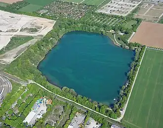 Der Grundwassersee entstand zwischen 1937 und 1938 nach dem Ende des von der Reichsbahn betriebenen Kiesabbaus auf dem Gelände[1]. Heute ist der rundum als Erholungsgebiet umgestaltete 11,1 ha große Baggersee ein beliebter Badesee. Er ist an der tiefsten Stelle bis zu 12,5 m tief.[2]