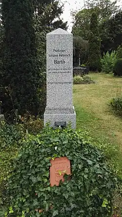Im Jahre 1865 starb Heinrich Barth an einem Magendurchbruch, möglicherweise der Spätfolge einer Schussverletzung, die er auf seiner Mittelmeerreise 1847 in Libyen erlitten hatte und „unter großen Schmerzen“ an einer „Zerberstung des Magens“, wie Rudolf Virchow in seinem Obduktionsbericht feststellt.[9] Er wurde in Berlin auf dem Friedhof III der Jerusalems- und Neuen Kirche vor dem Halleschen Tor beigesetzt. Die Grabstelle wird von einem kleinen liegenden Grabstein markiert.[10]